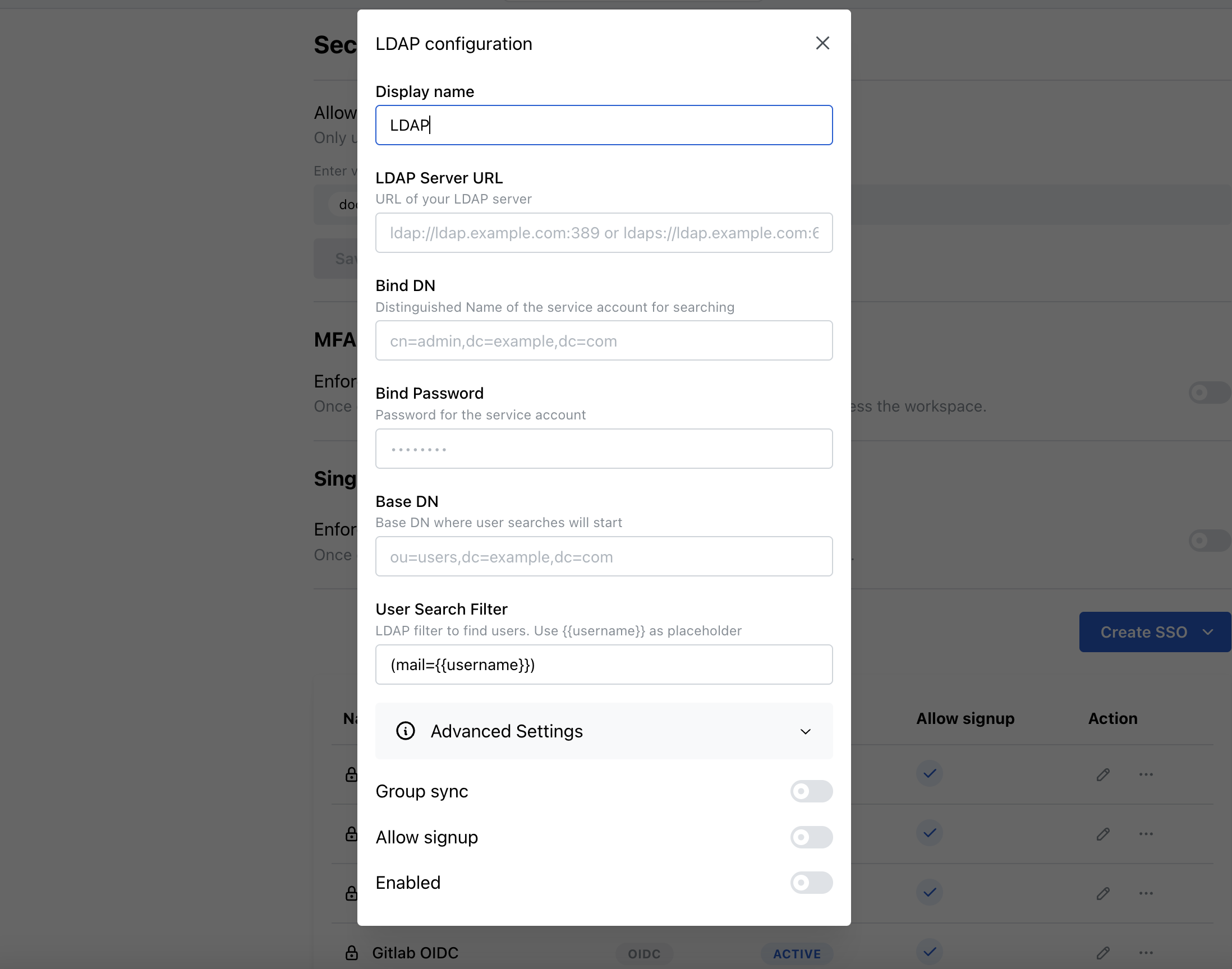 | Bind DN | Distinguished Name of the service account used for searching | cn=admin,dc=example,dc=com |