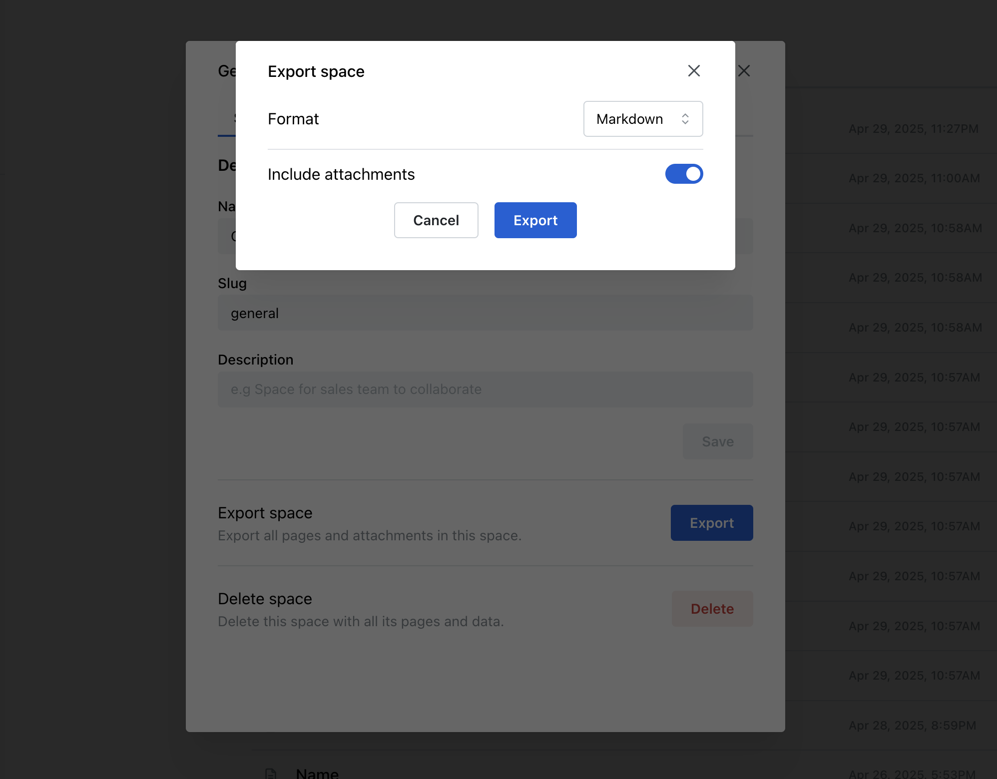 - Toggle the Include attachments option if you want to export attached files along with your content.