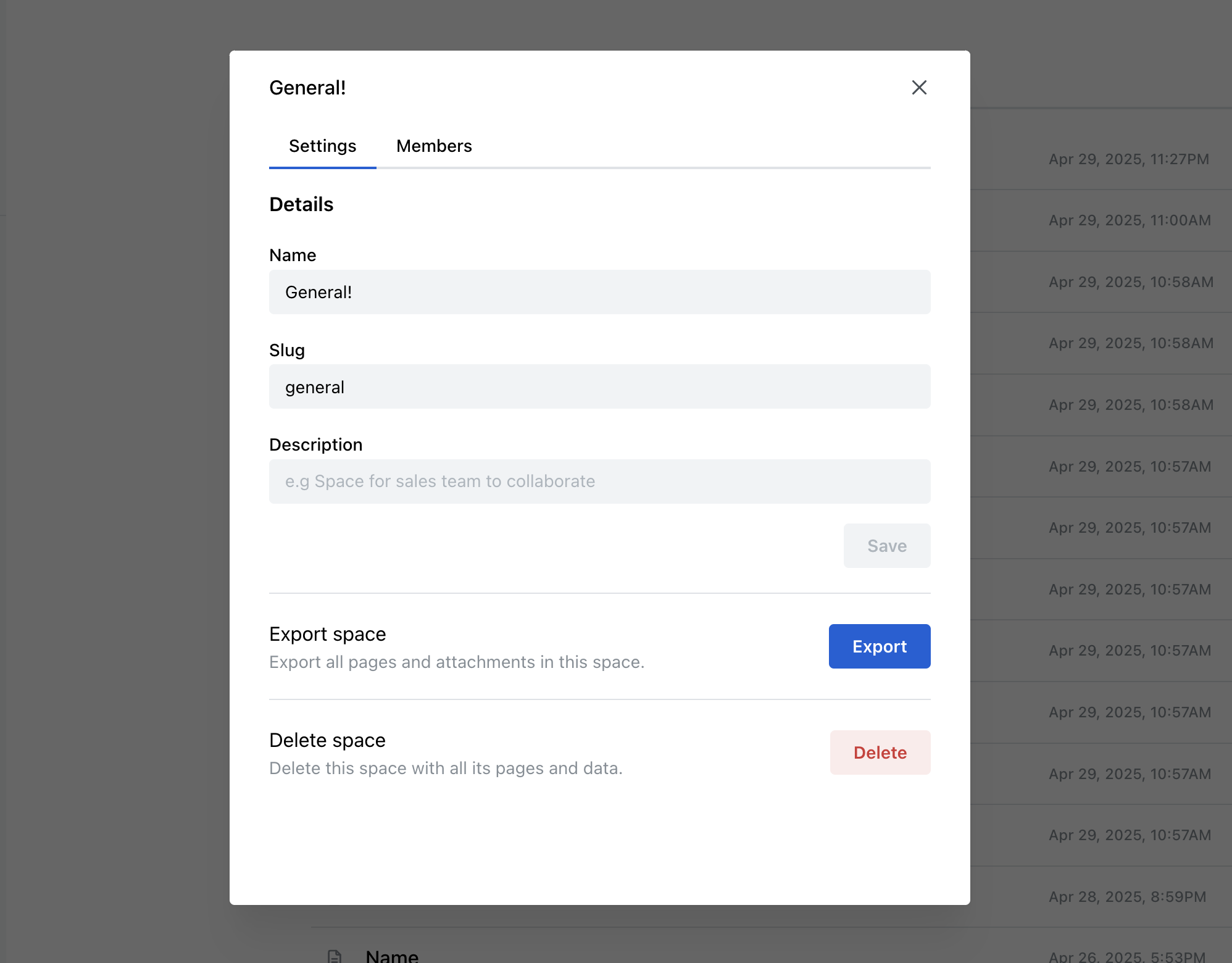 ⚠️ This action is irreversible. The space and all its content will be permanently deleted.